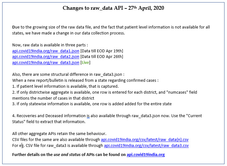 Covid19indiaorg Sur Twitter Changes To Our Api Considering The Volume And Nature Of Data We Are Receiving We Have Restructured The Raw Data Api Please Read The Notes Attached Here